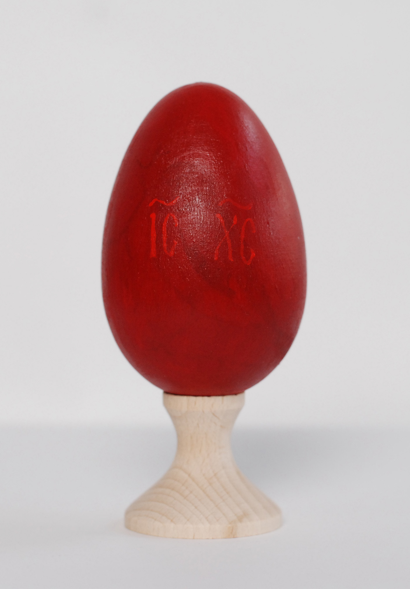 Pisanka jest zabezpieczona werniksem i umieszczona na drewnianej podstawce, dzięki czemu może być eksponowana jak miniatura ikony.